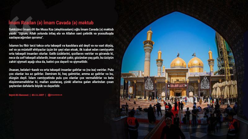 Səkkizinci İmam Əli ibn Musa Rza (əleyhissəlam) oğlu İmam Cavada (ə) məktub yazdı: "Oğlum, Allah yolunda infaq elə və Allahın səni çətinlik və yoxsulluqda saxlayacağından qorxma".