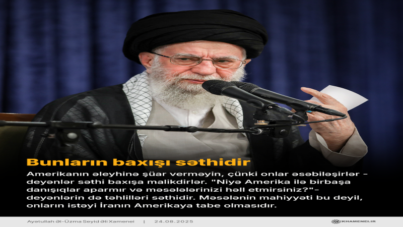 "Amerikanın əleyhinə şüar verməyin, çünki onlar əsəbiləşirlər - deyənlər səthi baxışa malikdirlər. "Niyə Amerika ilə birbaşa danışıqlar aparmır və məsələlərinizi həll etmirsiniz?"- deyənlərin də təhlilləri səthidir. Məsələnin mahiyyəti bu deyil, onların istəyi İranın Amerikaya tabe olmasıdır".
