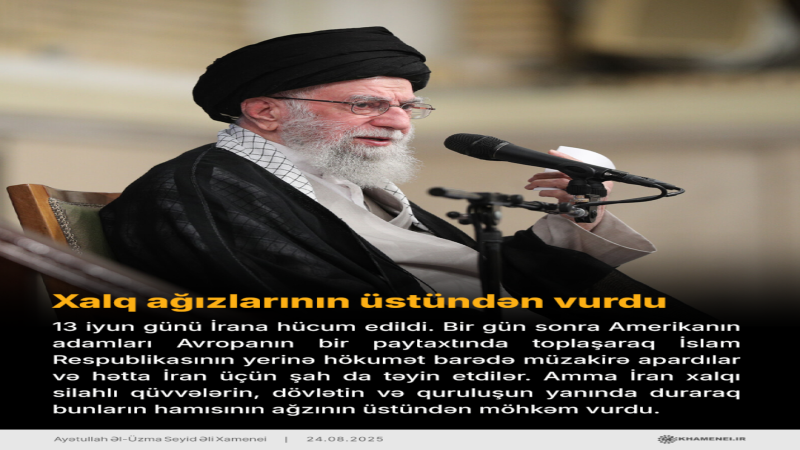 "Bu gün İran xalqı vəhdətdədir. Siyasi-ictimai fikir ayrılıqları mövcuddur, amma bu quruluş və ölkənin müdafiəsində, düşmənə qarşı müqavimətdə vəhdət halındadır. Bu birlik düşmənin zərərinədir və onların təcavüz və hücumlarına mane olur".