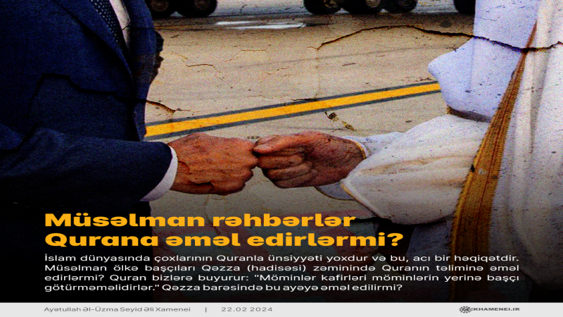 İslam dünyasında çoxlarının Quranla ünsiyyəti yoxdur və bu, acı bir həqiqətdir. Müsəlman ölkə başçıları Qəzza (hadisəsi) zəminində Quranın təliminə əməl edirlərmi? Quran bizlərə buyurur: "Möminlər kafirləri möminlərin yerinə başçı götürməməlidirlər." Qəzza barəsində bu ayəyə əməl edilirmi?