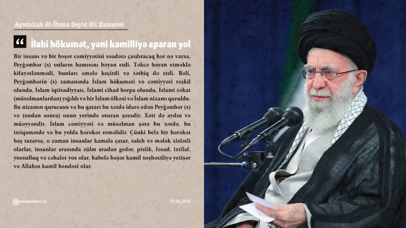 Bir insanı və bir bəşər cəmiyyətini səadətə çatdıracaq hər nə varsa, Peyğəmbər (s) onların hamısını bəyan etdi. Təkcə bəyan etməklə kifayətlənmədi, bunları əmələ keçirdi və tətbiq də etdi. Bəli, Peyğəmbərin (s) zamanında İslam hökuməti və cəmiyyəti təşkil olundu, İslam iqtisadiyyatı, İslami cihad bərpa olundu, İslami zəkat (müsəlmanlardan) yığıldı və bir İslam ölkəsi və İslam nizamı quruldu. Bu nizamın qurucusu və bu qatarı bu xətdə idarə edən Peyğəmbər (s) və (ondan sonra) onun yerində oturan şəxsdir. Xətt də aydın və müəyyəndir. İslam cəmiyyəti və müsəlman şəxs bu xətdə, bu istiqamətdə və bu yolda hərəkət etməlidir. Çünki belə bir hərəkət baş tutarsa, o zaman insanlar kamala çatar, saleh və mələk xislətli olarlar, insanlar arasında zülm aradan gedər, pislik, fəsad, ixtilaf, yoxsulluq və cəhalət yox olar, habelə bəşər kamil xoşbəxtliyə yetişər və Allahın kamil bəndəsi olar.