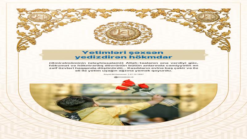 (Əmirəlmöminin (əleyhissalam)) Allah-təalanın ona verdiyi güc, hökumət və hökmranlıq dövrünün bütün anlarında cəmiyyətin ən zəif üzvləri haqqında düşünürdü… Kasıbların evinə baş çəkir və öz əli ilə yetim uşağın ağzına yemək qoyurdu.