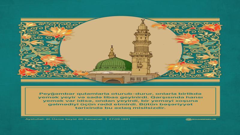 Peyğəmbər qulamlarla oturub-durur, onlarla birlikdə yemək yeyir və sadə libas geyinirdi. Qarşısına hansı yemək var idisə, ondan yeyirdi, bir yeməyi xoşuna gəlmədiyi üçün rədd etmirdi. Bütün bəşəriyyət tarixində bu əxlaq misilsizdir. Seyid Əli Xamenei 27.09.1991