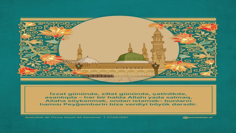 İzzət günündə, zillət günündə, çətinlikdə, asanlıqda – hər bir halda Allahı yada salmaq, Allaha söykənmək, ondan istəmək– bunların hamısı Peyğəmbərin bizə verdiyi böyük dərsdir. Seyid Əli Xamenei 27.09.1991