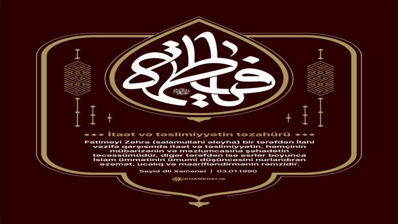 Fatimeyi Zəhra (salamullahi əleyha) bir tərəfdən İlahi vəzifə qarşısında itaət və təslimiyyətin, həmçinin mübarizənin və məzlumcasına şəhadətin təcəssümüdür, digər tərəfdən isə əsrlər boyunca İslam ümmətinin ümumi düşüncəsini nurlandıran əzəmət, ucalıq və maarifləndirmənin rəmzidir. Seyid Əli Xamenei 03.01.1990