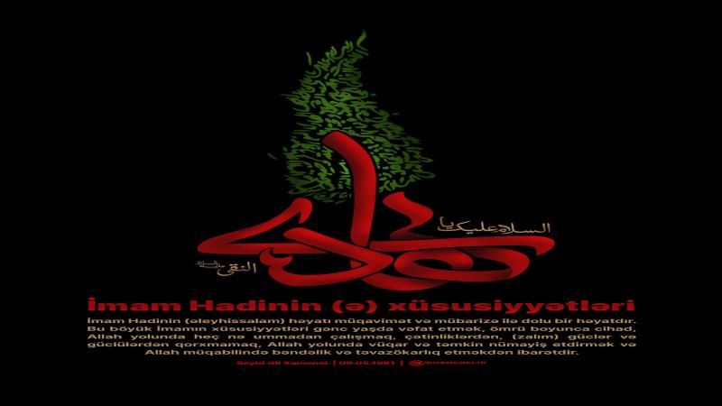 İmam_Hadinin (əleyhissalam) həyatı müqavimət və mübarizə ilə dolu bir həyatdır. Bu böyük İmamın xüsusiyyətləri gənc yaşda vəfat etmək, ömrü boyunca cihad, Allah yolunda heç nə ummadan çalışmaq, çətinliklərdən, (zalım) güclər və güclülərdən qorxmamaq, Allah yolunda vüqar və təmkin nümayiş etdirmək və Allah müqabilində bəndəlik və təvazökarlıq etməkdən ibarətdir. Seyid Əli Xamenei 08.05.1981