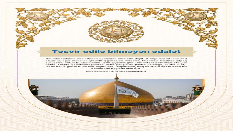 Əmirəlmömininin ədalətindən danışmaq mümkün deyil. O buyurur: “Allaha and olsun ki, əgər mənə ən şiddətli işgəncələri versələr, tikanların üstündə çılpaq sürüsələr, bütün bunlar mənim üçün qiyamət günü bir nəfərə belə zülm etdiyim halda Allahla qarşılaşmağımdan daha yaxşıdır!” (Nəhcül-Bəlağə, xütbə 224). Onda baxın görün bunu kim deyir; İran, Əfqanıstan, İraq və Misiri əhatə edən bir hökumətin başında olan biri. Seyid Əli Xamenei 25.06.2024