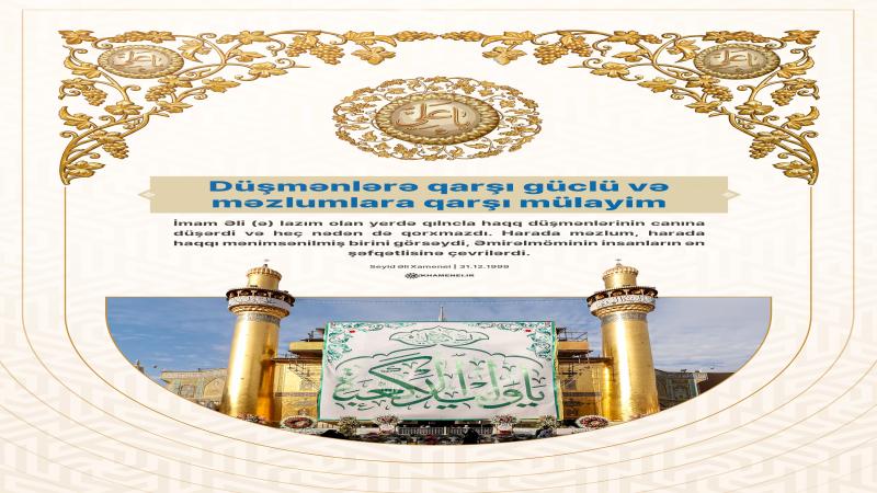 İmam Əli (ə) lazım olan yerdə qılncla haqq düşmənlərinin canına düşərdi və heç nədən də qorxmazdı. Harada məzlum, harada haqqı mənimsənilmiş birini görsəydi, Əmirəlmöminin insanların ən şəfqətlisinə çevrilərdi. Seyid Əli Xamenei 31.12.1999
