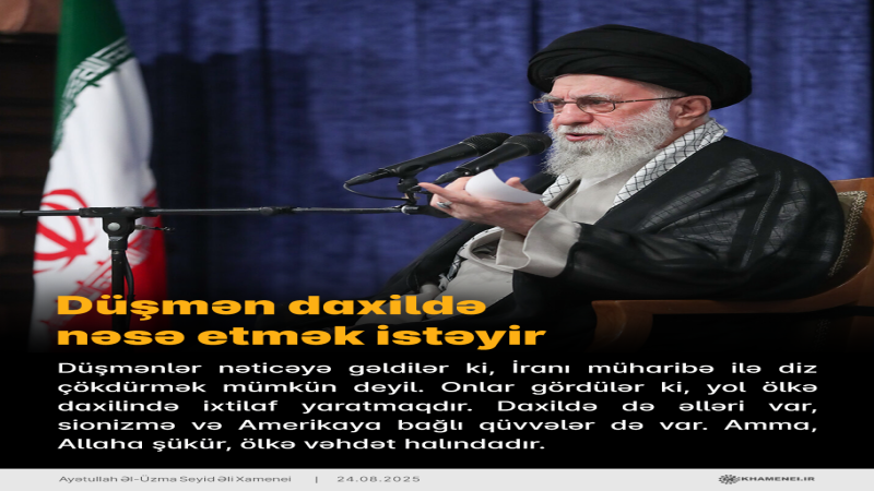 Düşmənlər nəticəyə gəldilər ki, İranı müharibə ilə diz çökdürmək mümkün deyil. Onlar gördülər ki, yol ölkə daxilində ixtilaf yaratmaqdır. Daxildə də əlləri var, sionizmə və Amerikaya bağlı qüvvələr də var. Amma, Allaha şükür, ölkə vəhdət halındadır. Seyid Əli Xamenei 24.08.2025
