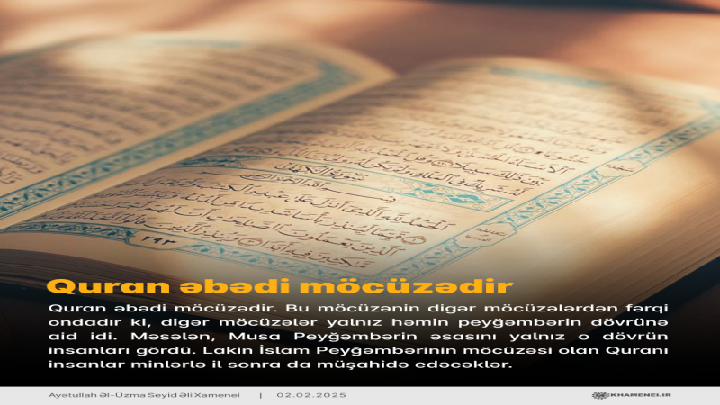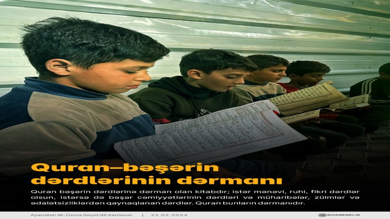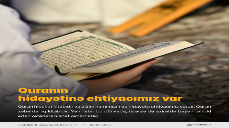 Hər kəsə Quranla ünsiyyəti unutmamağı tövsiyə edirəm. Mən dəfələrlə demişəm ki, Quranın hər yerindən yarım səhifə olsa belə, hər gün oxuyun. Quranı açın, yarım səhifə, bir səhifə və hər nə qədər rəğbət və meyiliniz var oxuyun. Mənəviyyatla əlaqənizi qoruyun. Seyid Əli Xamenei 03.11.2025