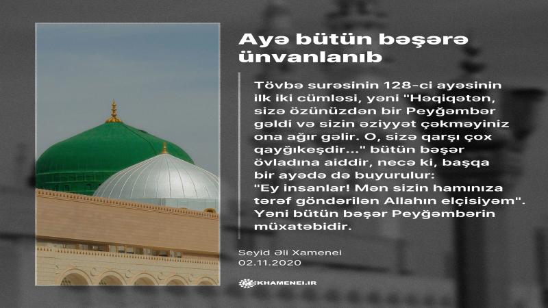 Tövbə surəsinin 128-ci ayəsinin ilk iki cümləsi, yəni "Həqiqətən, sizə özünüzdən bir Peyğəmbər gəldi və sizin əziyyət çəkməyiniz ona ağır gəlir. O, sizə qarşı çox qayğıkeşdir..." bütün bəşər övladına aiddir, necə ki, başqa bir ayədə də buyurulur: "Ey insanlar! Mən sizin hamınıza tərəf göndərilən Allahın elçisiyəm". Yəni bütün bəşər Peyğəmbərin müxatəbidir.