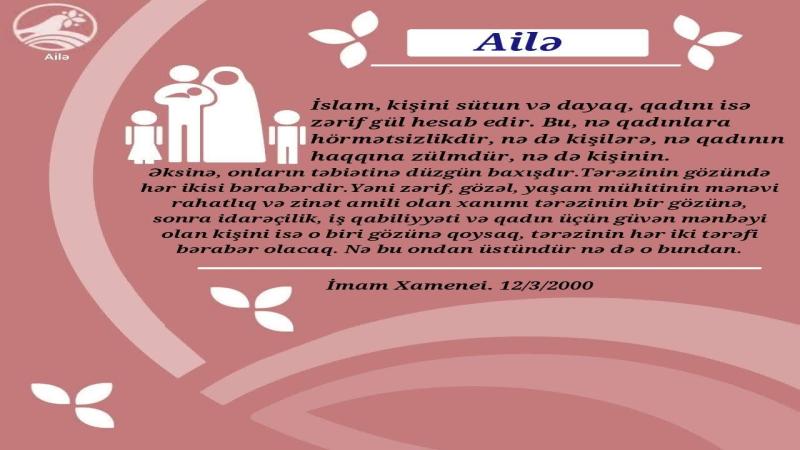 Hər bir ailə cəmiyyətin bədəninin hüceyrələrindən biridir. Bu hüceyrələr sağlam olsalar, işlərini düzgün görsələr, cəmiyyətin bədəni də sağlam olacaqdır.