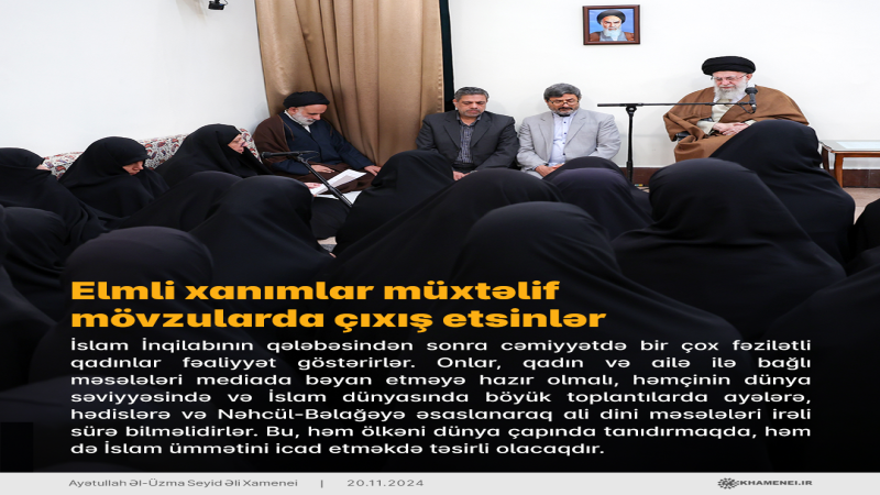 İslam İnqilabının qələbəsindən sonra cəmiyyətdə bir çox fəzilətli qadınlar fəaliyyət göstərirlər. Onlar, qadın və ailə ilə bağlı məsələləri mediada bəyan etməyə hazır olmalı, həmçinin dünya səviyyəsində və İslam dünyasında böyük toplantılarda ayələrə, hədislərə və Nəhcül-Bəlağəyə əsaslanaraq ali dini məsələləri irəli sürə bilməlidirlər. Bu, həm ölkəni dünya çapında tanıdırmaqda, həm də İslam ümmətini icad etməkdə təsirli olacaqdır.